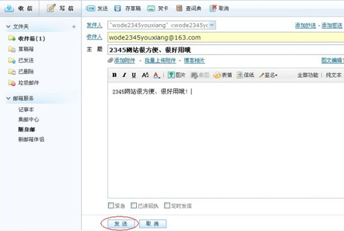 在写邮件的页面中填写相应内容:收件人、主题、内容。最后点击“发送”即可